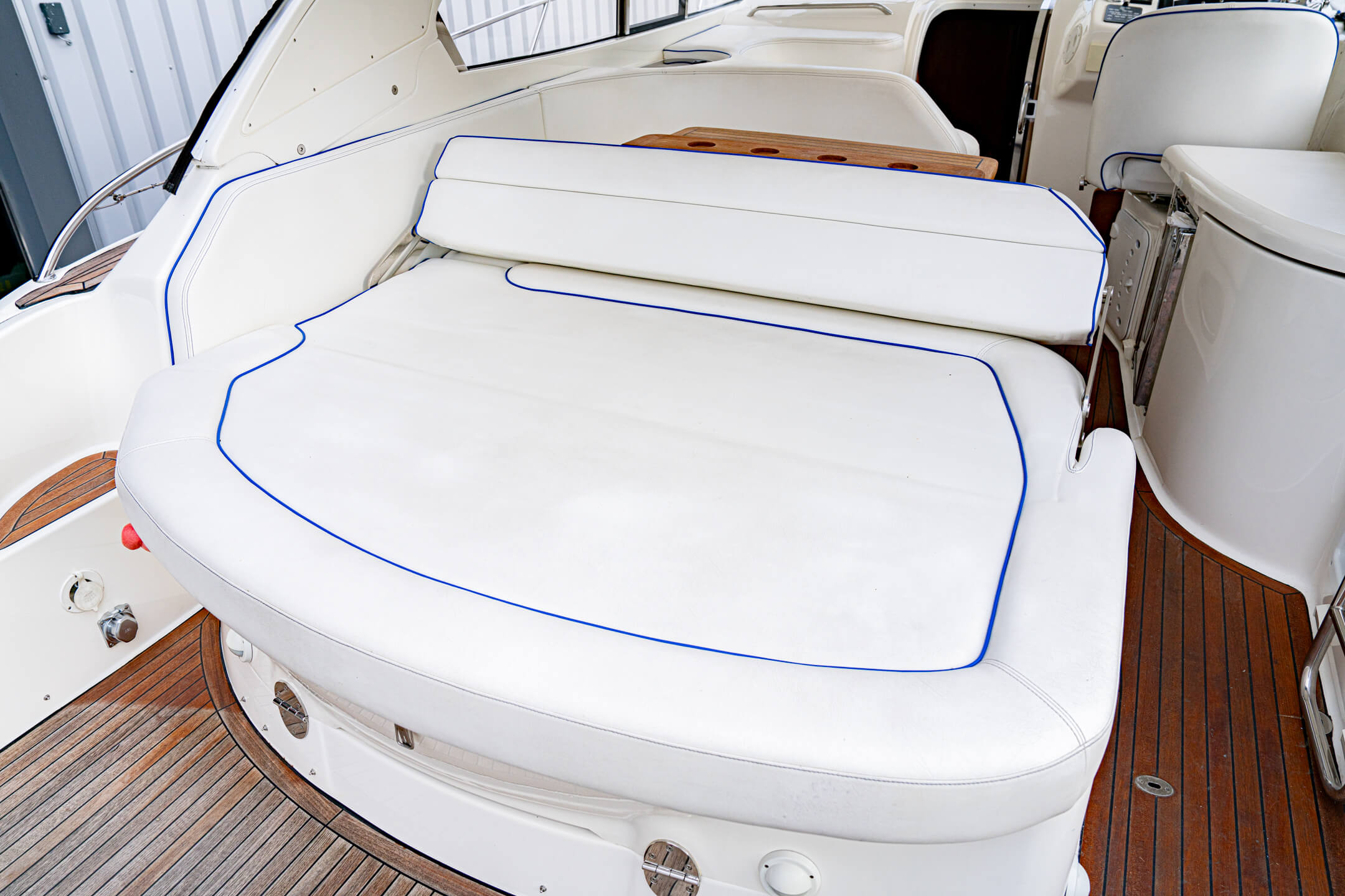 Rumpffarbe weiss mit Zierstreifen in blau; Holzfarbe Mahagoni, Fussboden Ocean line; Hochwertige Arbeitsplatte „Aspen“; DPS; Delta-Anker 10 kg inkl. Ankerkette Edelstahl; Teak auf Laufdeck, Teak auf Cockpitboden, Additive Badeplattform mit Teak