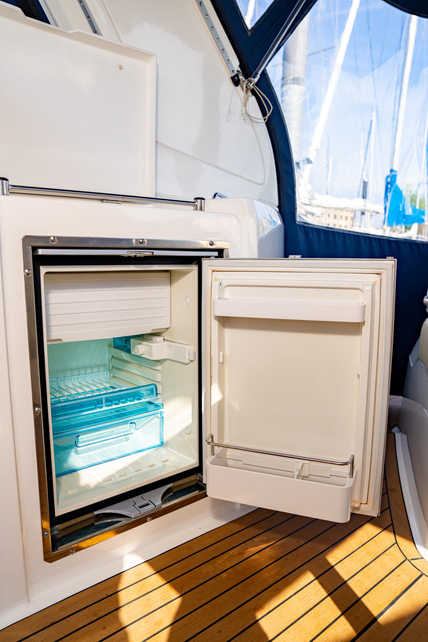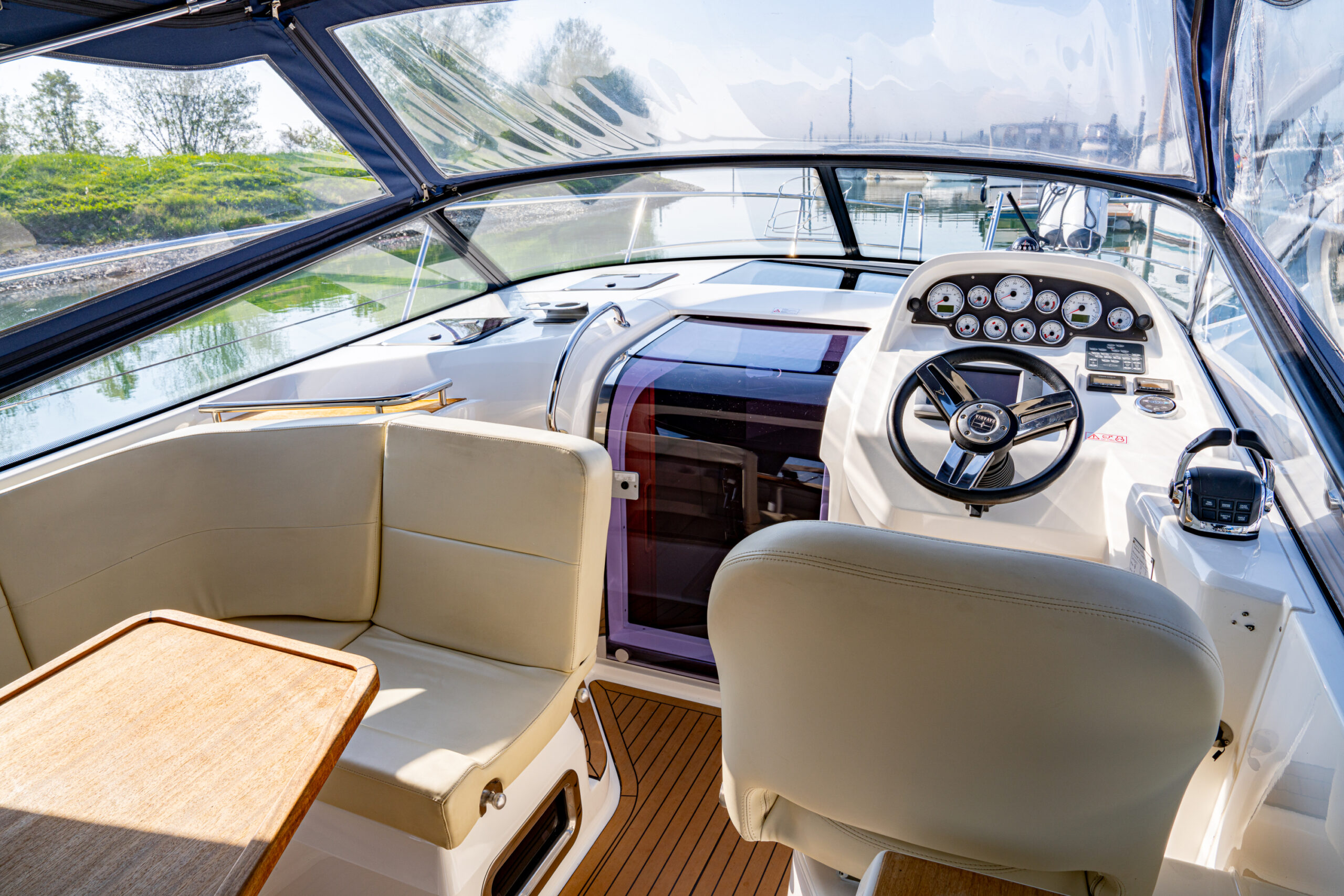 Duscheinrichtung in Nasszelle, Beifahrersitz klappbar, Sonnenpolster auf Vordeck + Getränkehalter Cockpit, Massivholz auf Cockpitoden und Laufdeck, Badeplattform additiv, Kühlschrank im Cockpit 12V, Gaskochfeld, Elektrische Ankerwinde, Delta-Anker, Ankerkette 50m, Bugstrahlruder SE60 elektrisch inkl. Batterie, Camperverdeck „konfektioniert“ in Nachtblau, Ganzpersenning zweiteilig.