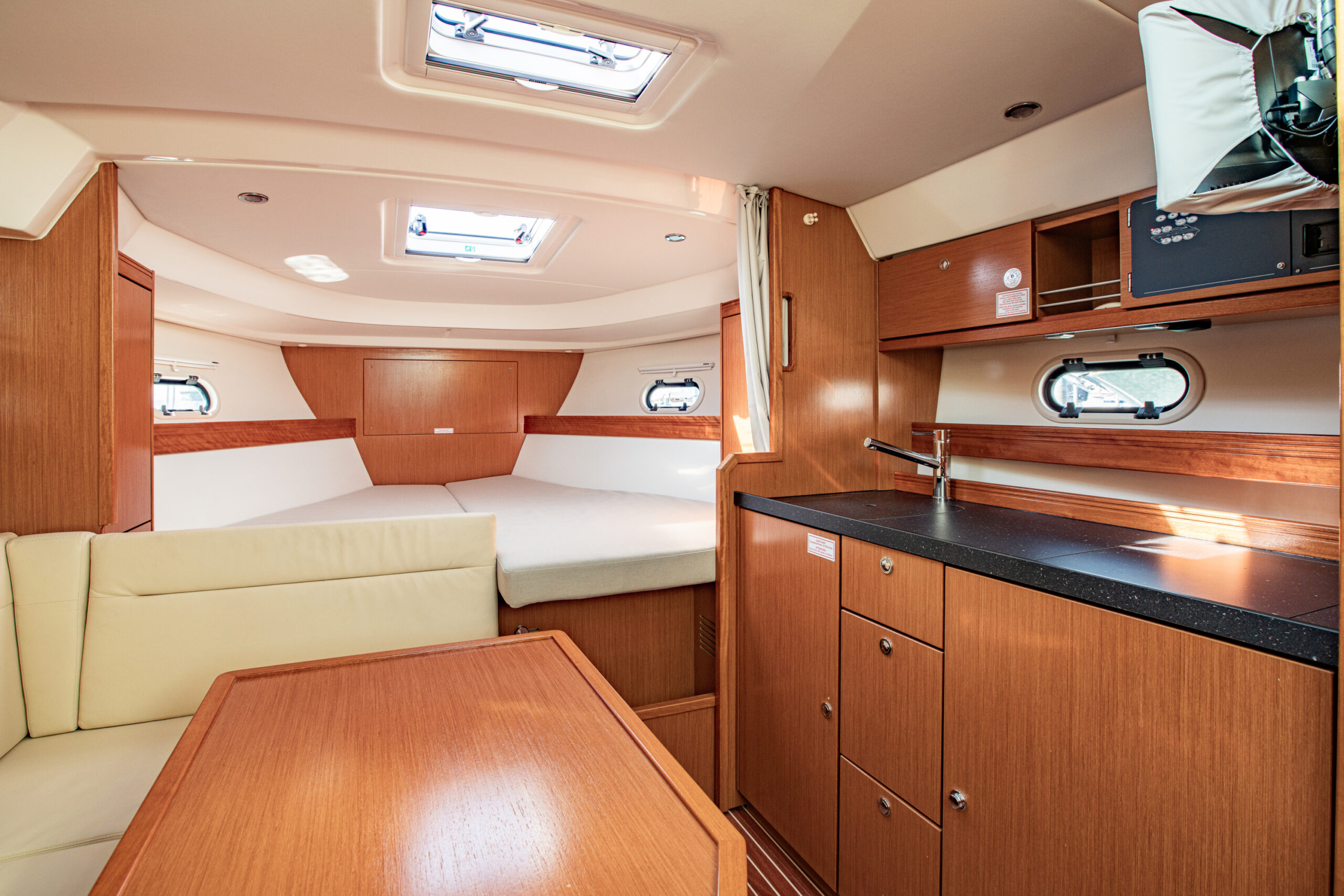 Rumpffarbe: seidengrau matt; Holzfarbe: Mahagoni Look, Fussboden Ocean Linie; Cockpitpolster: Sand; Innenpolster: Kunstleder Kaiman Chapagner;