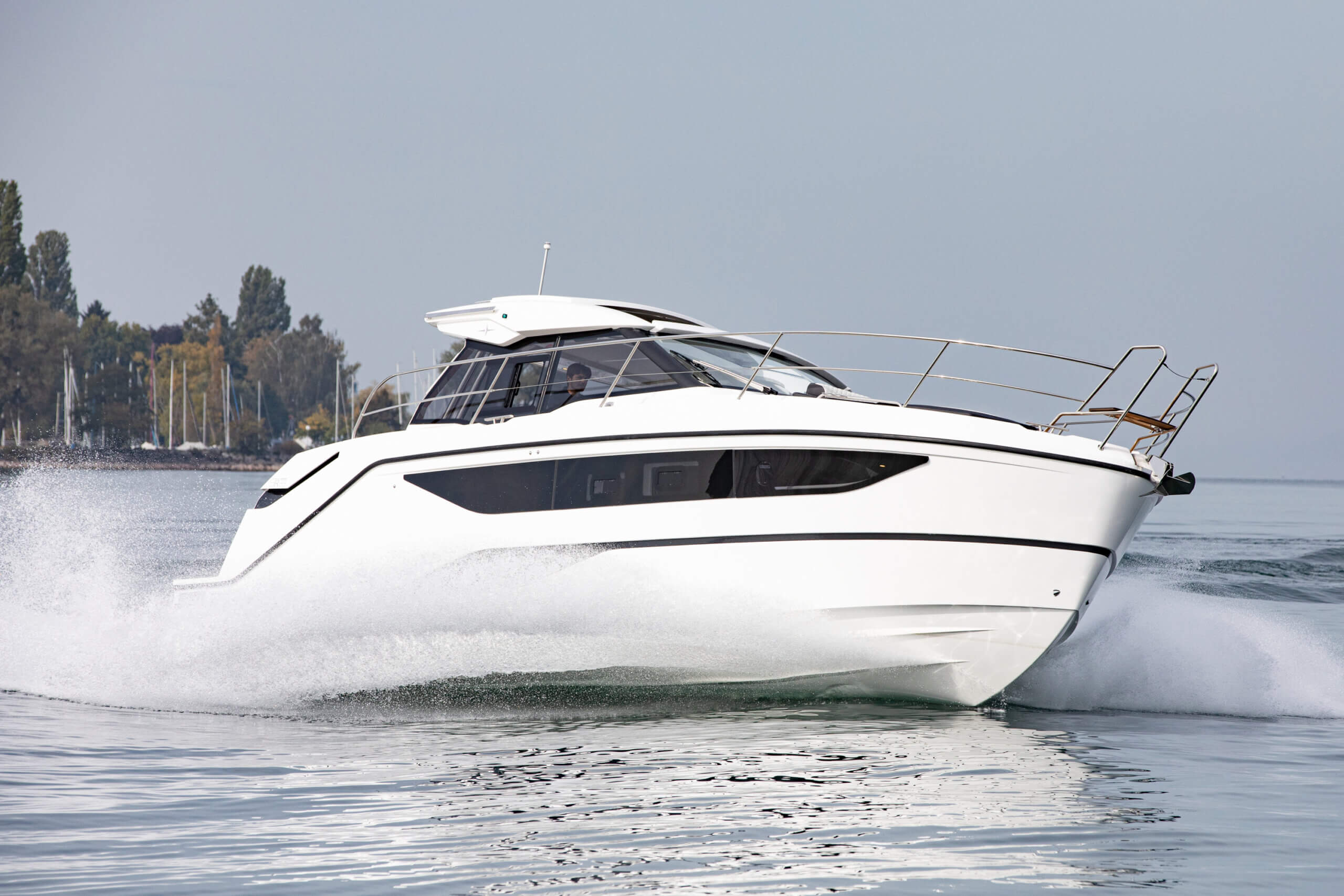 MerCruiser Joystick; Rumpffarbe weiss mit Zierstreifen in schwarz; Cockpitpolster Suntex mit Maglia, Granite, Carbon; Hochwertige Arbeitsplatte „Crispy Milk“; Polster aus Kunstleder „Oyster“; Sonnenpolster auf Vordeck; Teak auf Cockpitboden; Teak auf Laufdeck; Elektrische Ankerwinde; Delta-Anker 16 kg inkl. Ankerkette 50 m, Edelstahl; Trimmklappen elektrisch; Bugstrahlruder 80 kgf, elektrisch inkl. Betriebsbatterie; WC elektrisch; Lichtpaket Interieur; ; Lichtpaket Exterieur (inkl. Unterwasser-, Stufen-, Motorraum- und Laufdeckbeleuchtung); Fusion MS-RA770 Apollo Marine Radio mit DAB+ und jeweils 2 Lautsprechern im Salon und Cockpit inkl. Fernbedienung FUSION ERX400; GFK-Schiebedach, elektrisch; Grauwassertank 120l, Opacmare Gangway hydraulisch.
