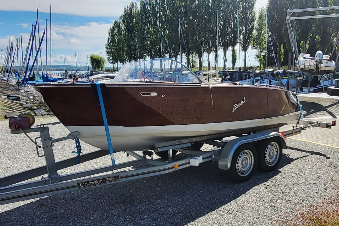 Klassisches Holzboot vom 1966: Boesch 510 „DeLuxe“ mit Bodenseezulassung. Zustand: gut. Motor: Crusader 180 (180,10 PS / 132,50 kW).