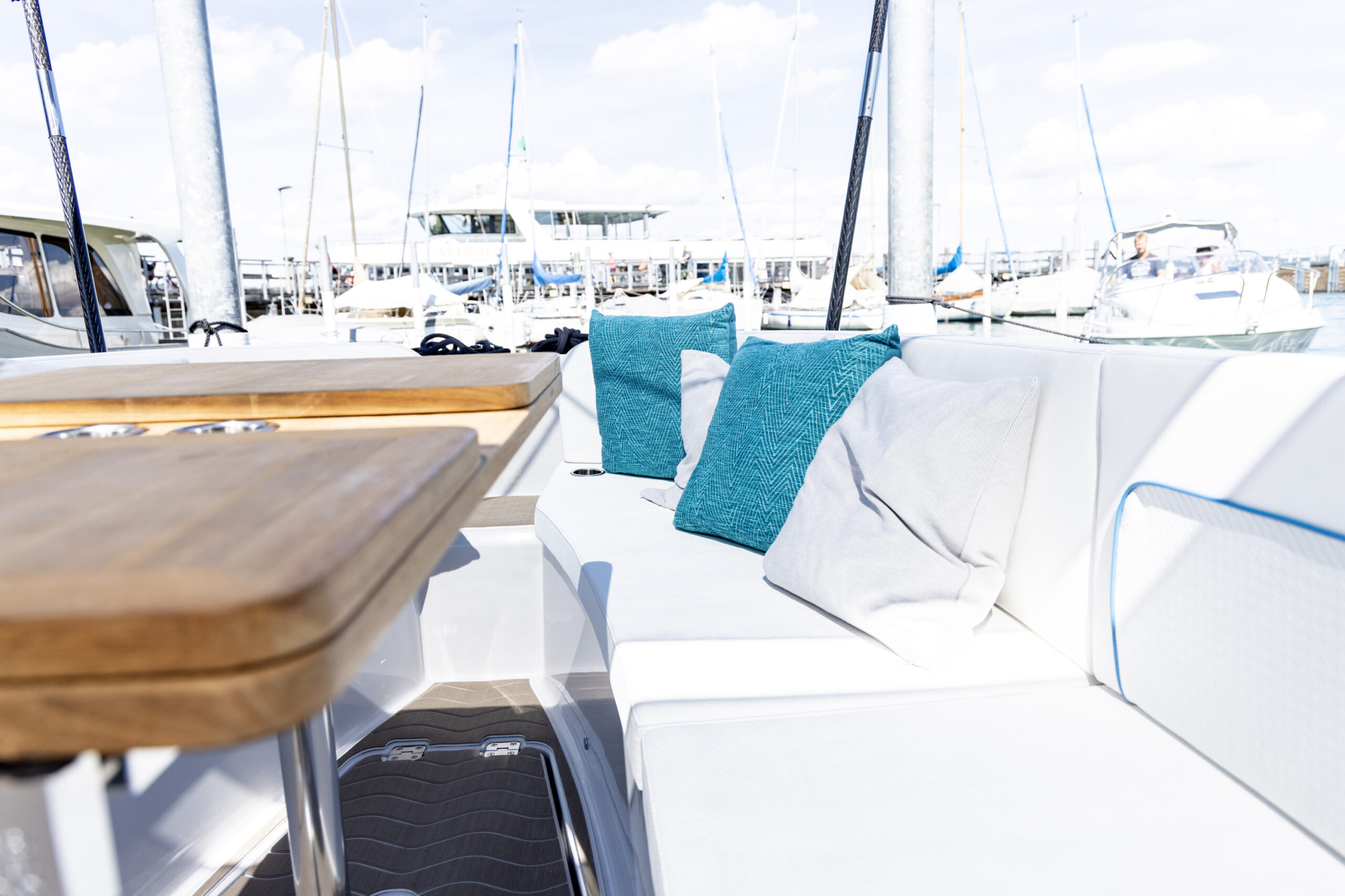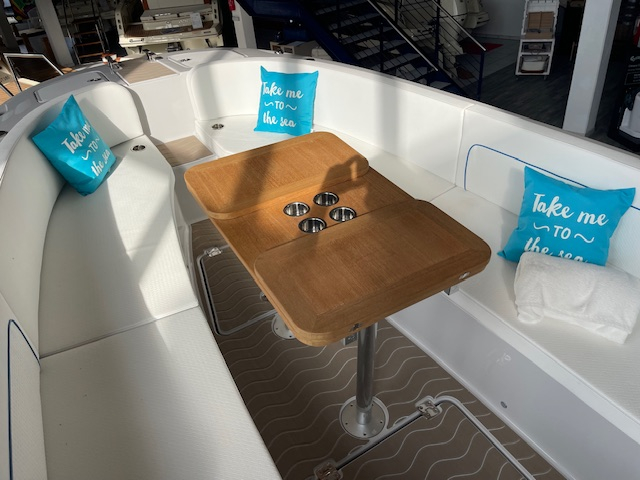 Eine entspannte und gesellige Atmosphäre an Deck wird durch ein äußerst vielseitiges Layout verstärkt. Rund um den großen Klapptisch ist bequem Platz für mindestens 6 Personen, außerdem kann dieser Bereich schnell und unkompliziert zur Liegefläche umgewandelt werden. In dieser Konfiguration wird der gesamte Bugbereich des Bootes für maximalen Komfort in ein Sonnendeck mit voller Breite nutzbar.