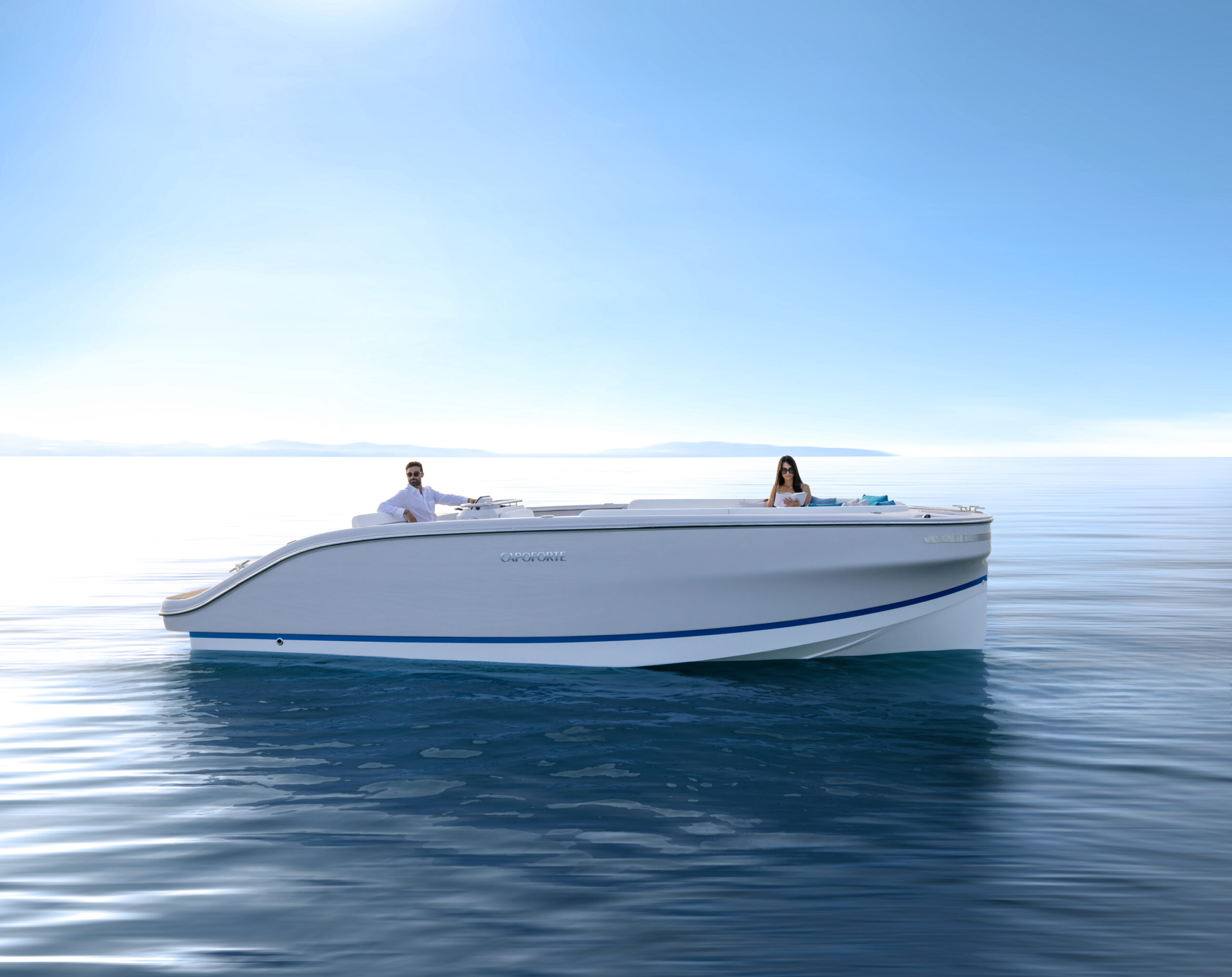 Für dieses erste Elektromodell hat Designer Christian Grande einen Rumpf entworfen, der mit dem Molabo Iscad 50 kW Innenbord-Elektromotor (bis zu 80kW) ein schnelles sportliches Gleiten möglich macht und dafür optimiert ist. Es ist 7.38 Meter lang und 2.46 Meter breit und kann bis zu acht Personen befördern. Der gesamte Rumpf ist in Infusionstechnik gefertigt und der breite, abgerundete Bug ermöglicht ein auf Komfort ausgerichtetes Deckslayout.