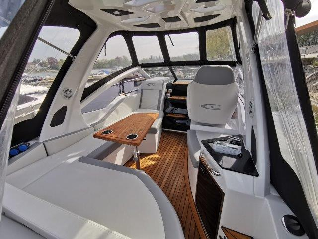 Diverse Sitze für 5 Personen, verstellbares Steuerrad, großes Sonnensofa mit Rückenlehne, Windschutzscheibe, einstellbarer Fahrersitz, Ablagen, Spüle, Dosenhalter, herausnehmbarer Teppich, Lautsprecher, 230V Landanschluss, Stufenbeleuchtung, Ski Haken, Licht 12V, abschließbare Plexiglastüre, Steuerkonsole mit Anzeigen, Badeplattform mit Leiter, Hauptschalter, Lenkrad