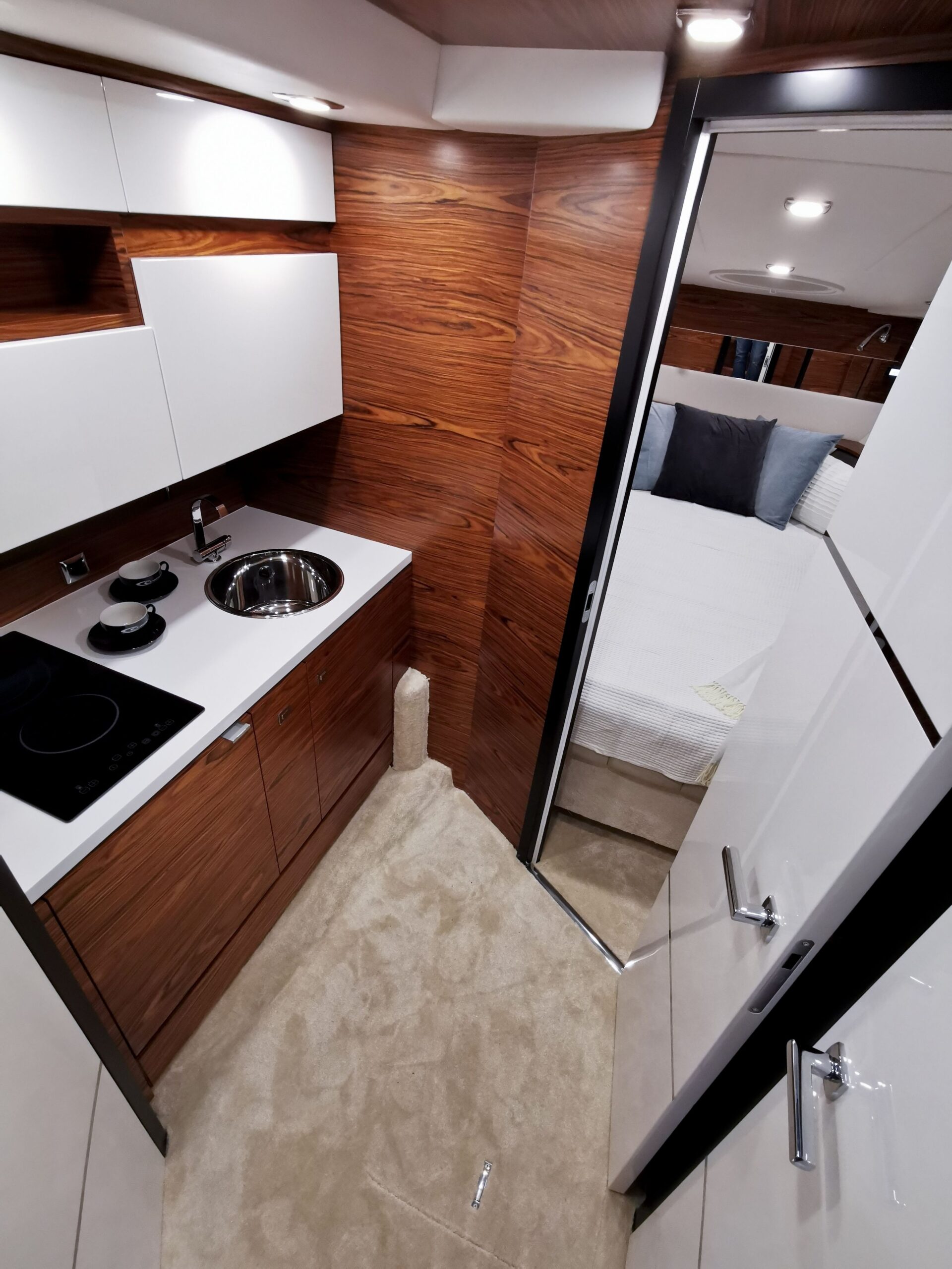 Küchenbereich: Küchenschränke, Arbeitsfläche in Kunststein, Verdecktes Schaltpanel, Elektroherd, Spüle, Edelstahl, 12 V Kühlschrank, 60 l, Beleuchtung, 230V Steckdose, hochwertiger Teppich