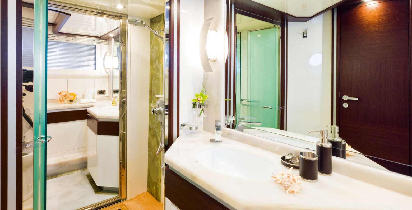 Im Inneren erwarten Sie drei vollwertige Kabinen für bis zu sechs Gäste, edle Materialien, durchdachtes Lichtdesign, optionale Marmorböden in den Badezimmern, Flatscreens und ein Deluxe-Interiorpaket. Die Crewkabine mit Bad ist dezent integriert – optional auch in Luxusausführung mit zweitem Bett, Waschmaschine, Trockner und eigener Minibar.