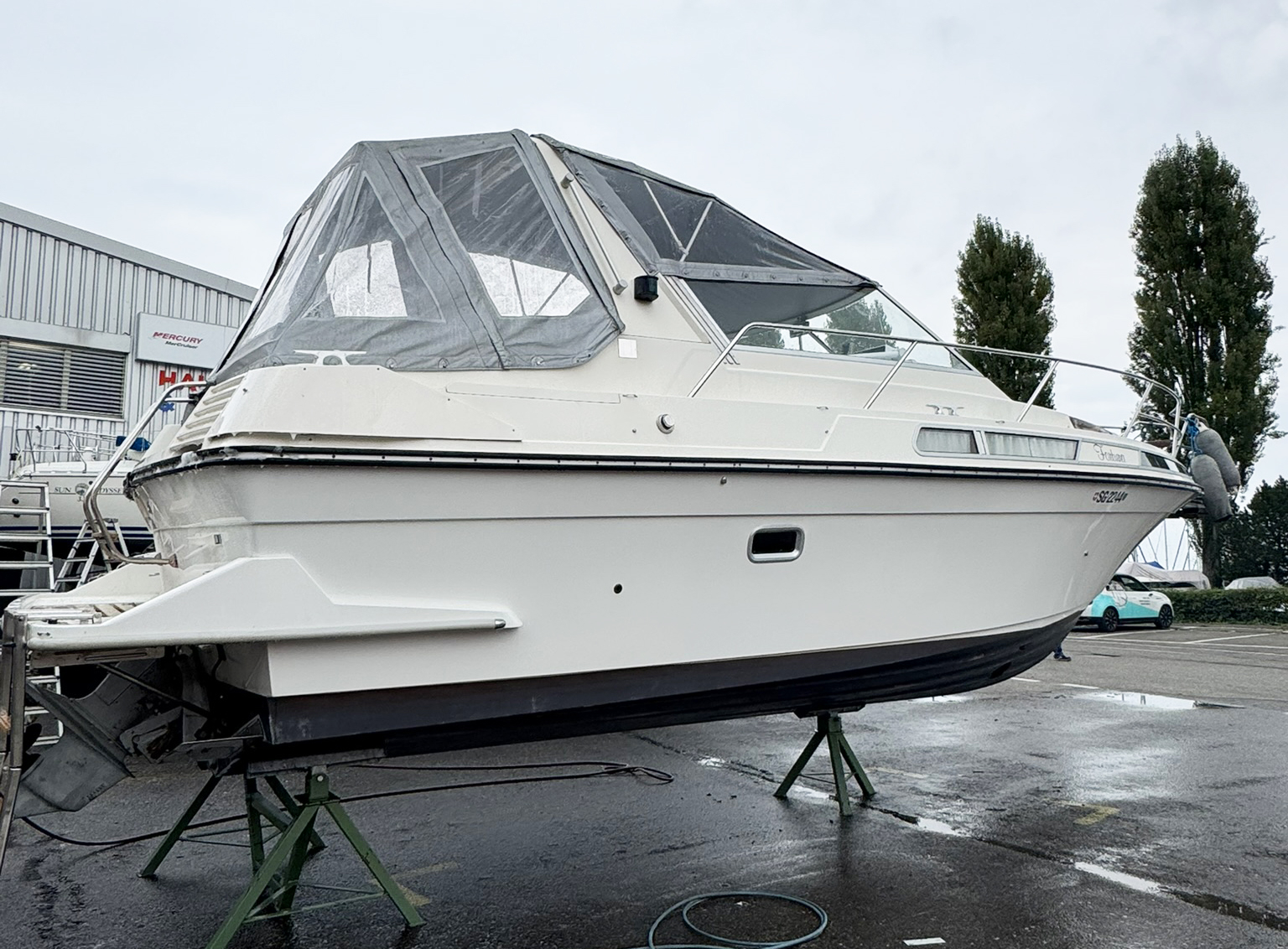 Kompass, Fishfinder, Tiefenmesser, Geschwindigkeitsmesser, Kocher, Spüle, Kühlbox (65 liter), Kühlschrank, Gefrierschrank, Ganzpersenning, Bimini-Top, Winterpersenning, Polster- und Camperverdeck neuwertig; Badeleiter, Badeplattform integriert, Deckdusche, Standheizung