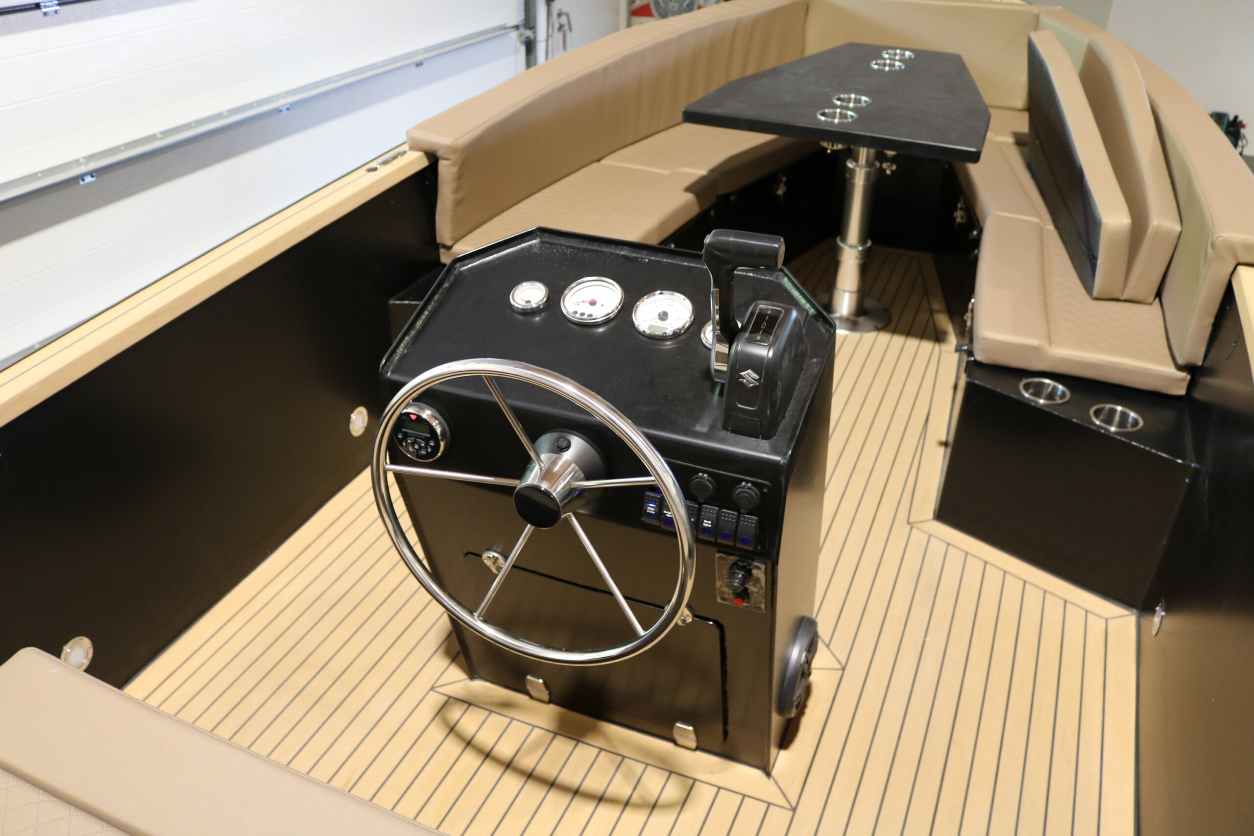 Lenkrad * Hydraulische Lenkung * Instrumententafel * Hupe * Navigationslichter * 12 V und USB-Buchse an der Konsole * Kraftstofftank 60 l * Batterie * Automatische Bilgenpumpe * Sitze und Rückenkissen * Stauraum unter den Sitzen * Gasdruckdämpfer * 8 x Edelstahlklampen * Abschleppöse * Ausziehbarer Haken & Ruder * Feuerlöscher, 2 kg * 3 x Luke * 6 x Getränkehalter * Lackierung * Auftriebsschaum * Ankerkasten * Beleuchtung Deck