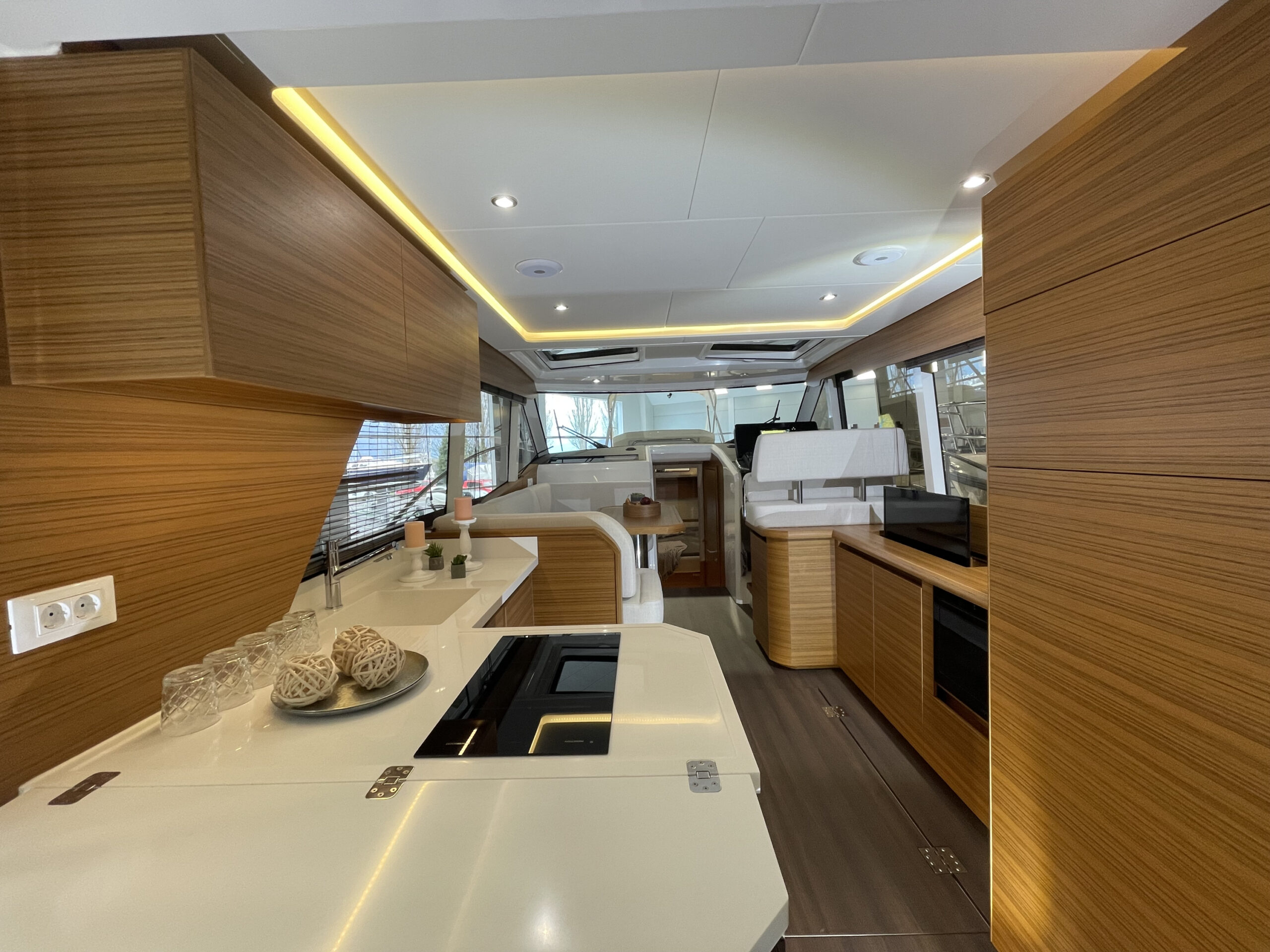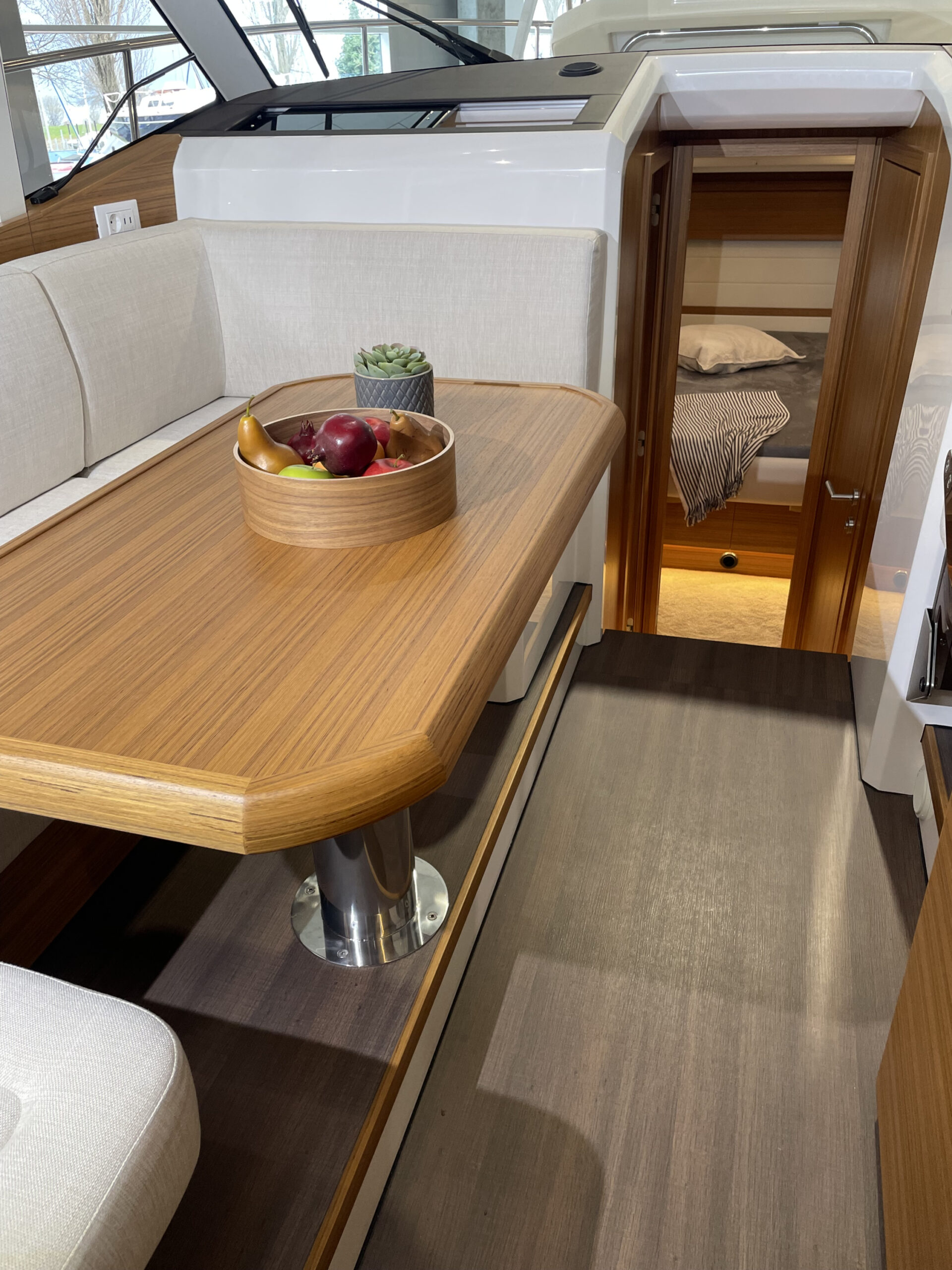 Schalen- und Kabinenfarbe „Pure White“; Holz golden Teak, Fussboden Dark Laminat, Kerrock Arbeitsplatte; Polster in Stoff „RUGANA GREY“; Massivholz im Cockpit, auf Laufdeck und Vorschiff; Sonnenliegepolster „grau“ mit höhenverstellbarer Rückenlehne; Bimini über Kopfbereich;