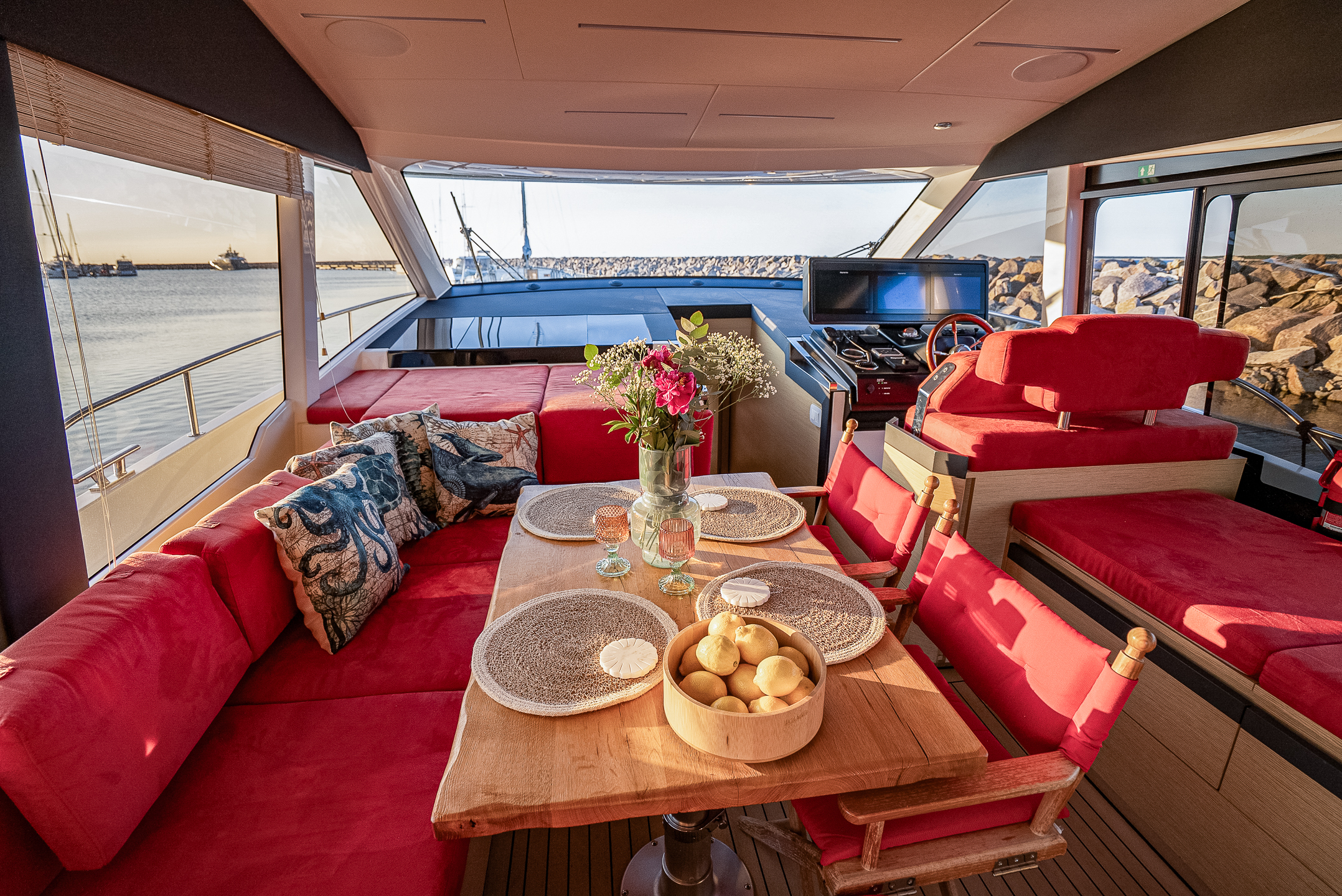 > Flybridge mit viel Platz zum Entspannen und atemberaubender Aussicht, ideal für sonnige Tage auf dem Wasser.