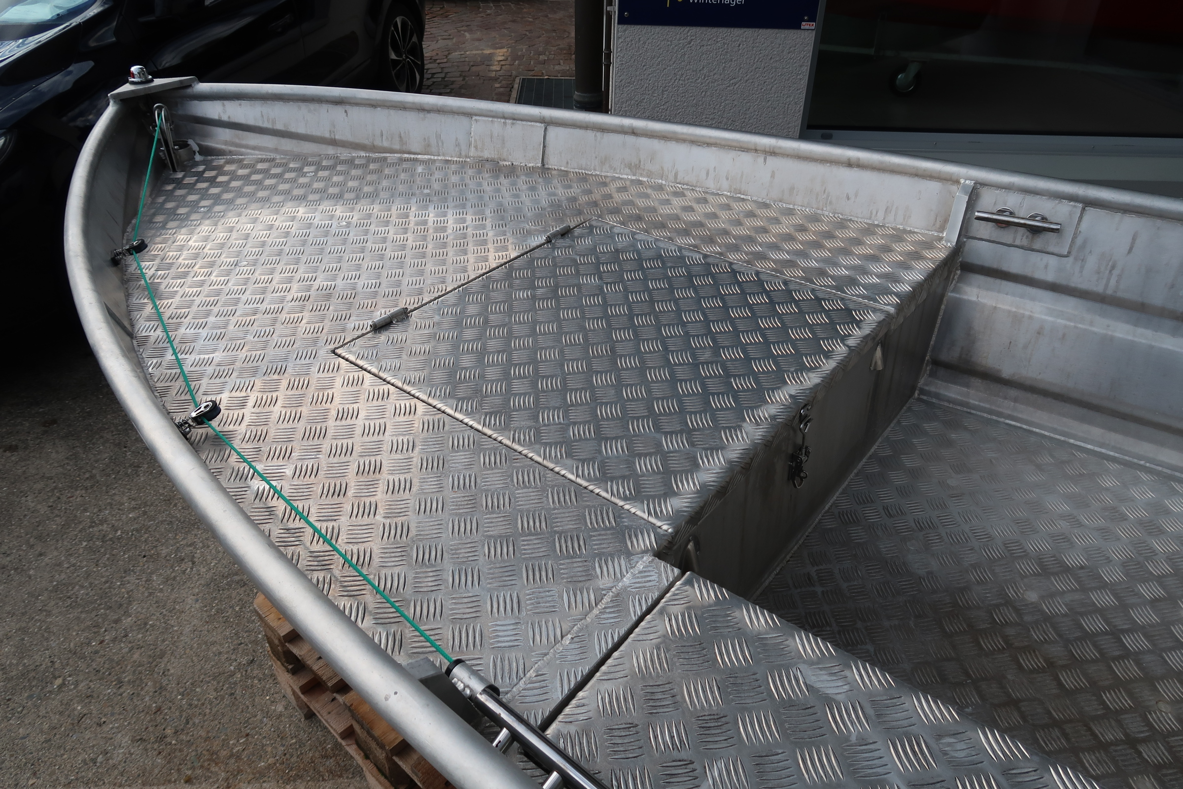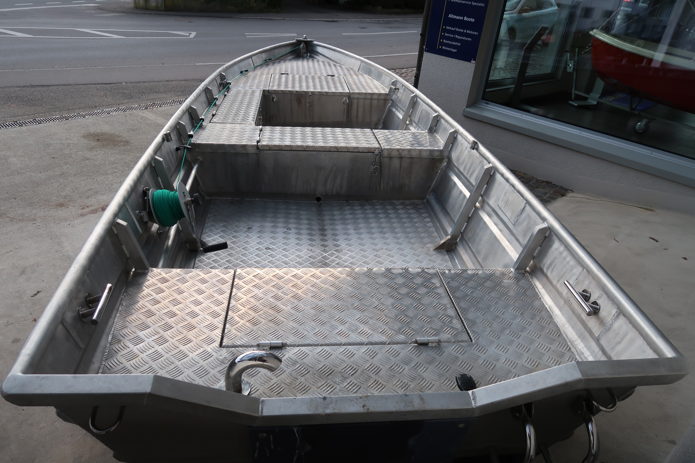 selbstlenzend, Antifouling Unterwasseranstrich, Fischkasten, Sitzruder mit Edelstahlgabeln, Badeleiter,Längstruhe mit Durchgang zum Bug, Ankerwinde