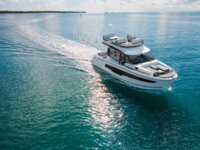 Cockpit- und Flybridge-Tische aus Holz, Teakboden auf Cockpit, Laufdeck und Badeplattformen, sowie Unterwasserbeleuchtung für stimmungsvolle Abende. Highlight: Seitliche, elektrisch absenkbare Terrasse. Mehr Platz zum Sonnenbaden, Entspannen und für bessere Bewegungsfreiheit an Bord.