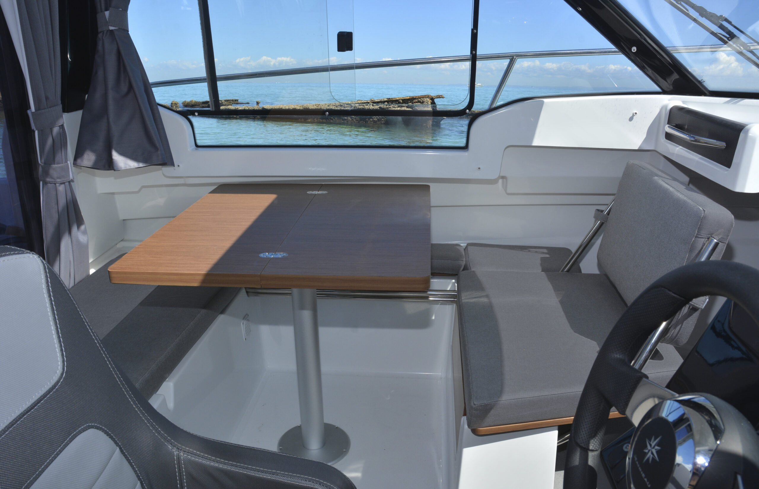 Cockpitsitzgelegenheit in U-Form inkl. Tisch und Sonnenliegepolster (umbaubar zur Sonnenliege); Sonnenverdeck über Cockpit „Sunbrella Graphite“; Verdeck-Set achtern „Sunbrella Graphite“; Halterung am Steuerhaus für Stand Up Paddle; Badeplattform mit Teak; Sonnenliegepolster auf Vorschiff; Elektrische Ankerwinde (ohne Anker); Bugstrahlruder (inkl. Batterie); Druckwassersystem für Version WC-Raum Steuerboard (ohne WC); 220 V Landanschluss + Ladegerät; Pantry Deluxe (Arbeitsplatte in Arpa schwarz, 2x Getränkehalter aus Edelstahl, Gasplatte mit Gasbox); Kühlschrank 42 L (inkl. Batterie); Polster-Erweiterung für Schlafkojen in der Kabine (nur mit Version „geschlossene Kabine“); Teppichset mit Druckknöpfen im Salon; Vorhänge im Steuerhaus; Scheibenwaschanlage; WC-Raum (ohne WC) mit Luke zum öffnen; Marine WC mit Fäkalientank