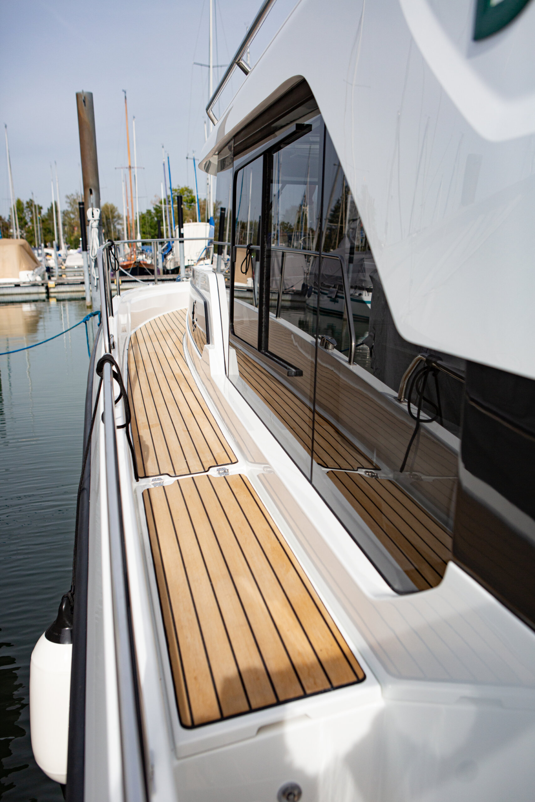 Elektrische Ankerwinde; Zipwake automatische Trimmklappen; Bugstrahler; 230 V Landanschluss + Ladegerät; Sonnenliege auf Vorschiff umbaubar zur Sitzbank; Suchscheinwerfer; Bugleiter, Halterung am Steuerhaus für Stand Up Paddle; Stauraumleiter im Cockpitboden; Horn; Cockpitboden, Laufdeck Steuerbord und Badeplattformen in Teak; LED Beleuchtung in Führer- und Vorschiffkabine; Sonnendach und Seitenteile für Sonnendach; LED Cockpitbodenbeleuchtung; Sitzbrett über Toilette; Bettkopfteil in Bugkabine; Erweiterung Doppelliege im Salon; Cockpitsitzkissen und Rückenpolster; Salonpolster „Jumbo Pure“; Kühlschrank 60 lt; Dusche im Cockpit; Warmwasserboiler; zusätzliche Hängeschränke in Vorschiffskabine; Teppichset mit Druckknöpfen im Salon und Kabinen; Vorhänge für Steuerhaus; Bolster Sitze Luxe