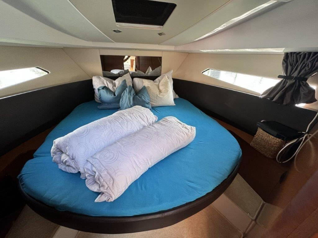 Badeleiter, Badeplattform integriert, Bluetooth-Konnektivität, Cockpit-Lautsprecher, Cockpittisch, Deckdusch, Fernseher, Heizung, Radio, Teak im Cockpit und auf Laufdeck, Unterwasseranstrich