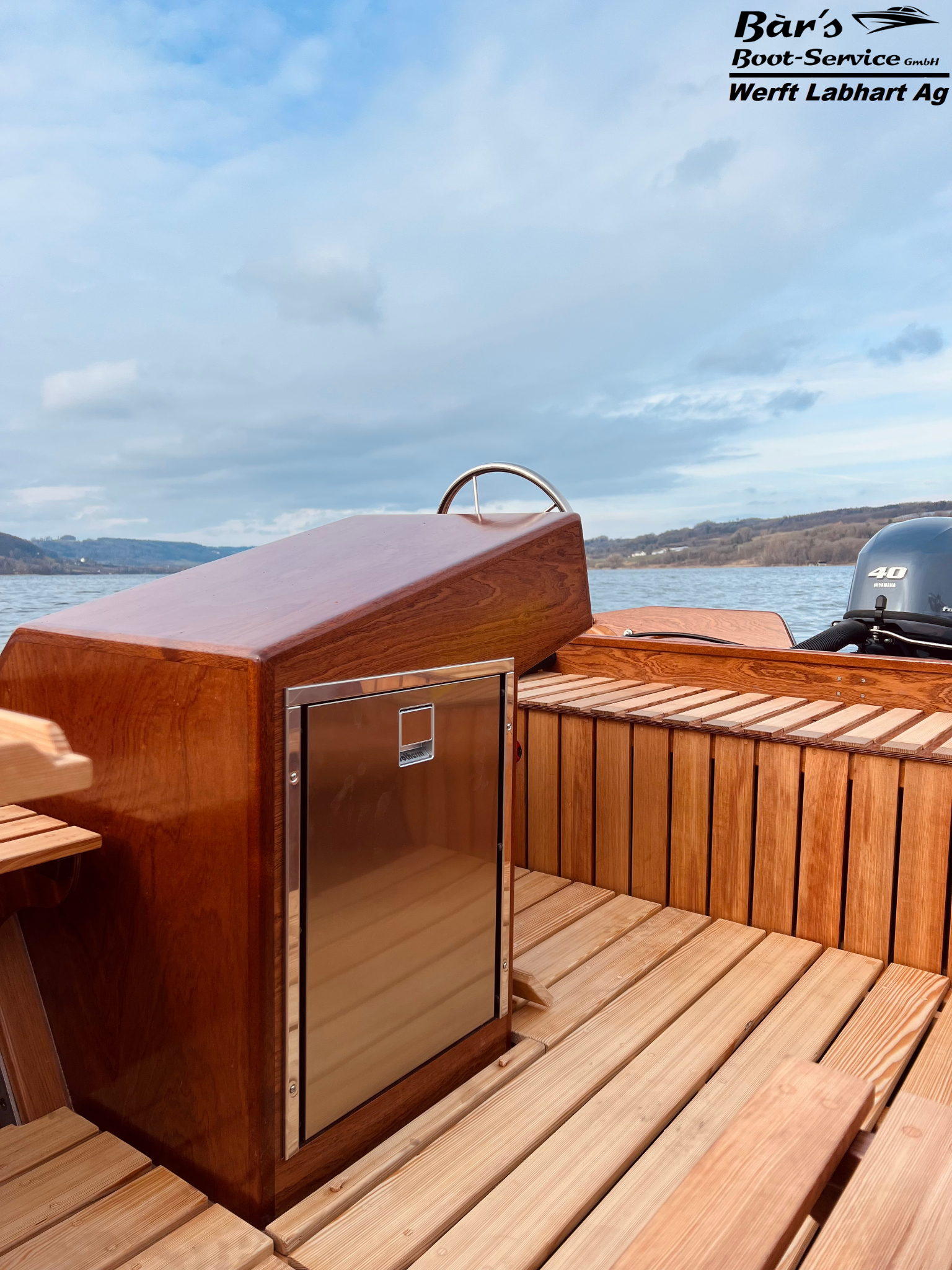 Ob Kühlschrank, 220V mit Inverter, 12V-Ladebuchsen, massgeschneiderte Polsterung, Tisch, Badeleiter, Sonnendach oder weitere Sonderausstattungen – Ihren Vorstellungen sind keine Grenzen gesetzt. Jedes Boot wird in präziser Handarbeit in unserer Werft in 8266 Steckborn gefertigt.