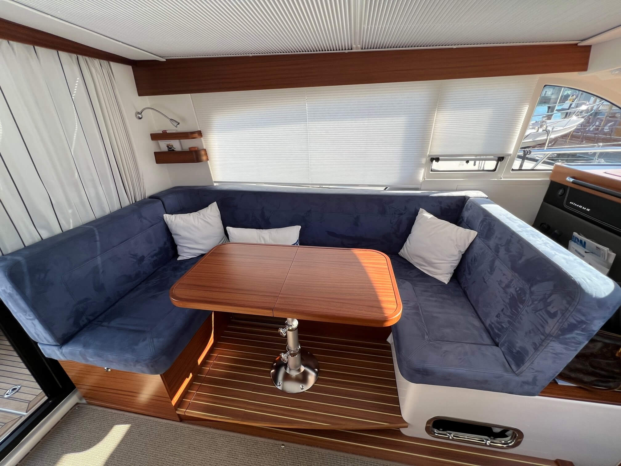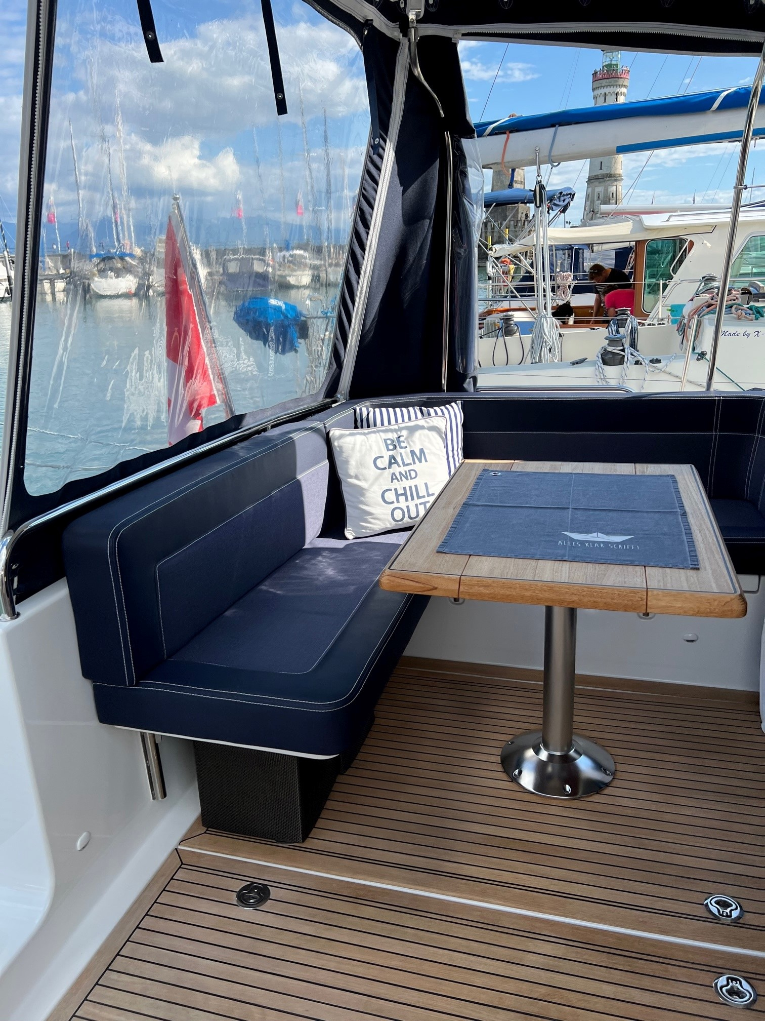 Zwei Stufen herab zum Vorschiff finden sich die Eigner- und die Unterflur-Gästekabine. Schrank- und Stauraum ist reichlich vorhanden, konfortable Nasszelle mit abgeteilter Dusche, die von der Eignerkabine und vom Durchgang aus zugänglich ist. Hinter dem Fahrstand die Pantry, gegenüber dem grossen Tisch mit U-Sofa, reichlich Raum, um mit vier Personen bequem zu essen oder mit sechs Personen bequem zu entspannen. Das U-Sofa lässt sich leicht in ein Extra-Doppelbett umbauen. hinter der Glasschiebetür die überdachte Pflicht mit Badeplattform. Ideal für Familien, die auch an Bord komfortabel und stilvoll wohnen möchten.