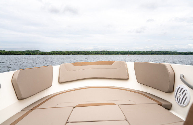 Badeleiter & Badeplattform, Navigationslichter, Bugankerkasten, GatorStep Bodenbelag (Mandel), Verstellbare Bug-Sonnenliege mit Polstern, Analoginstrumente (Speed, RPM, Trim), 12V-Anschluss, Einzelbatteriesystem, Cockpit- & Heck-Sitzbank mit Polsterung, Jensen Stereoanlage (2 Lautsprecher), VesselView Mobile, digitale Tiefenanzeige, Bimini-Top, Windschutzscheibe am Steuerstand, Mooring-Kit (Fender, Socken, Leinen), Elektrische Bilgepumpe, Feuerlöscher, Außenbordervorbereitung
