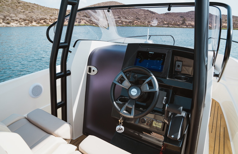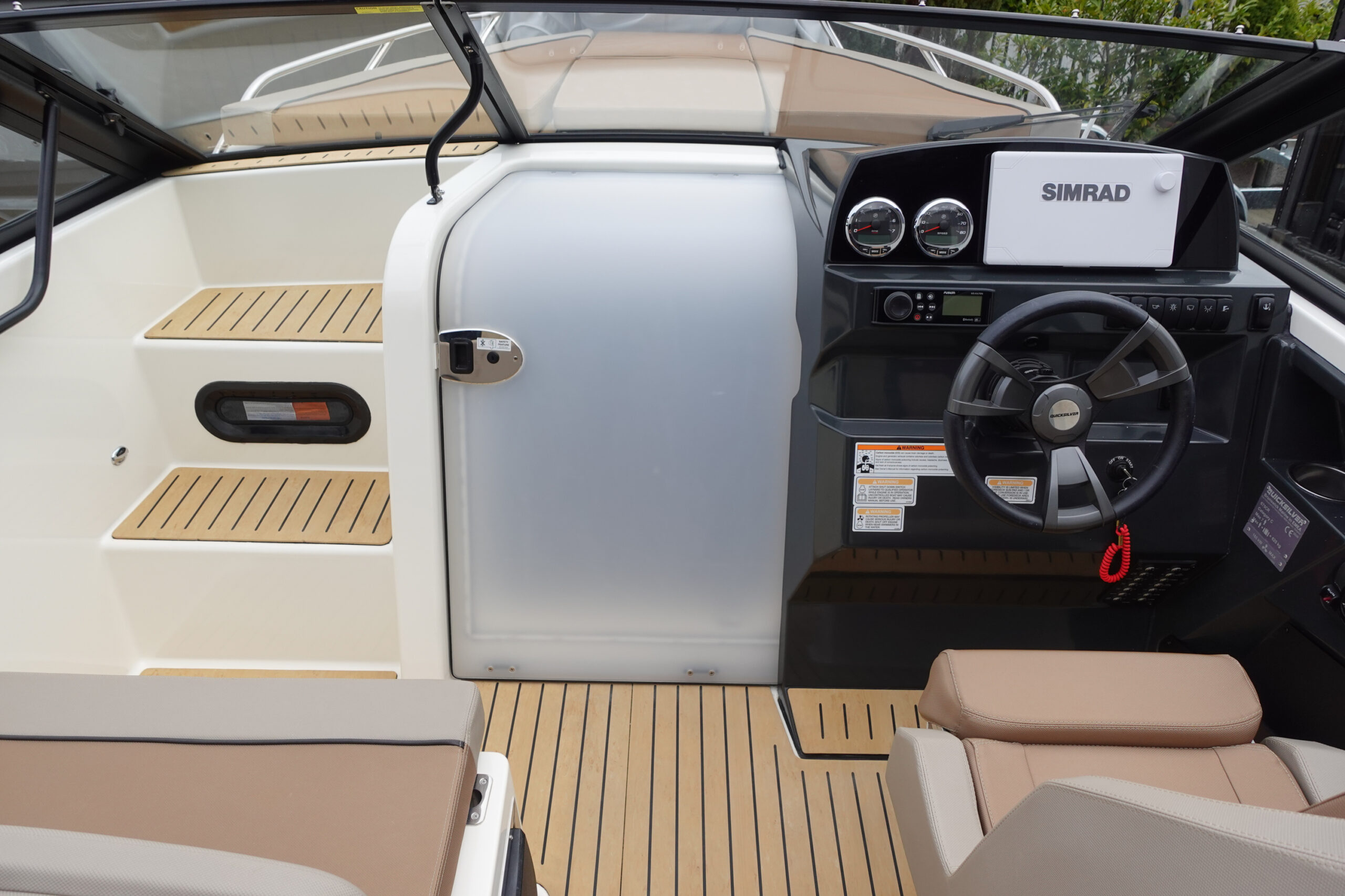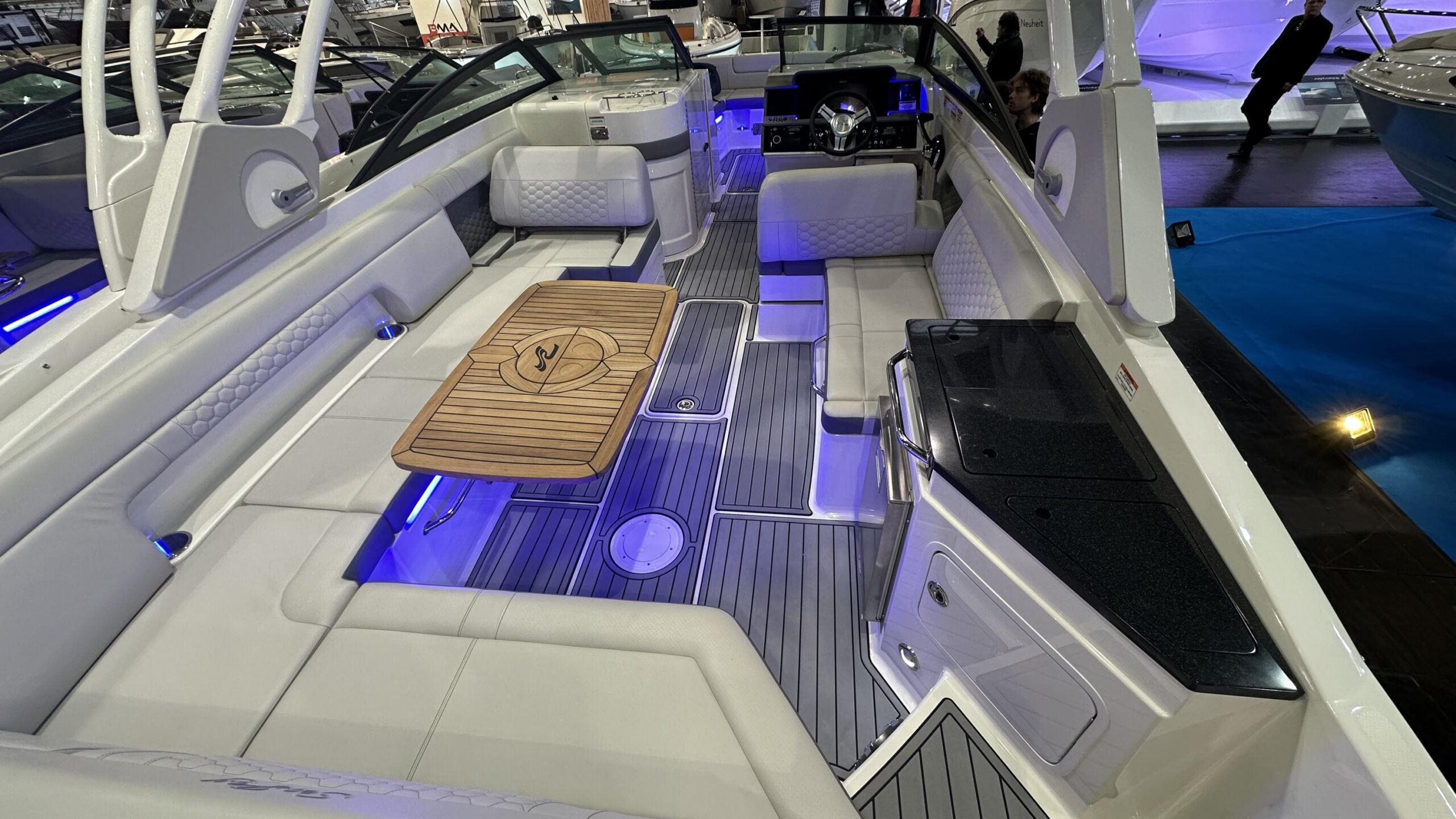 >Smart-Edition: LED-Innenbeleuchtung, Cockpittisch in Teak, Wasserskimast, Kühlschrank, Cockpitdusche, Fusion Stereoanlage, Simrad GPS/Chartplotter Cruise 9 mit HDI-Geber, Cockpit-Sonnenlounge, Mooring-Kit