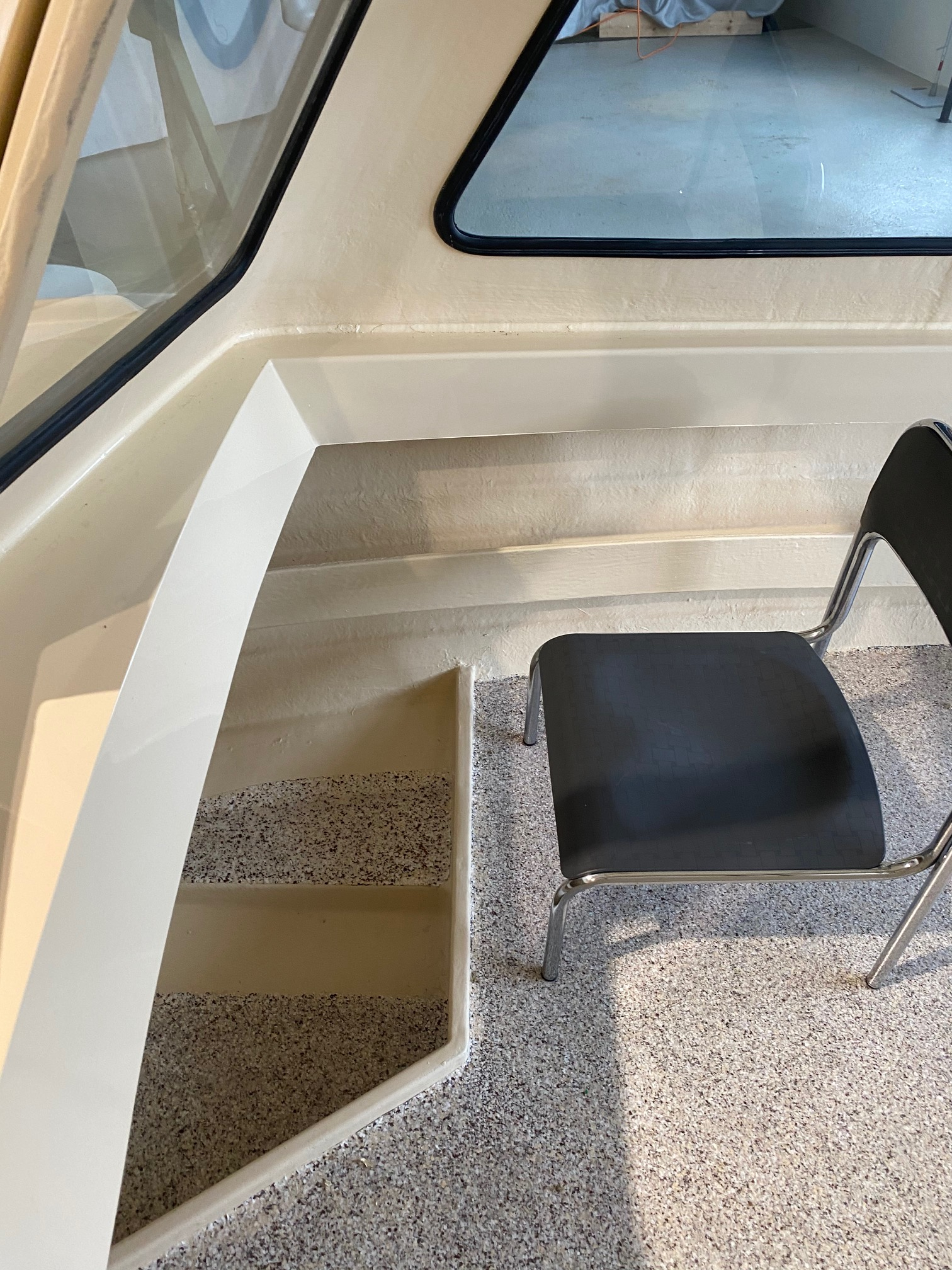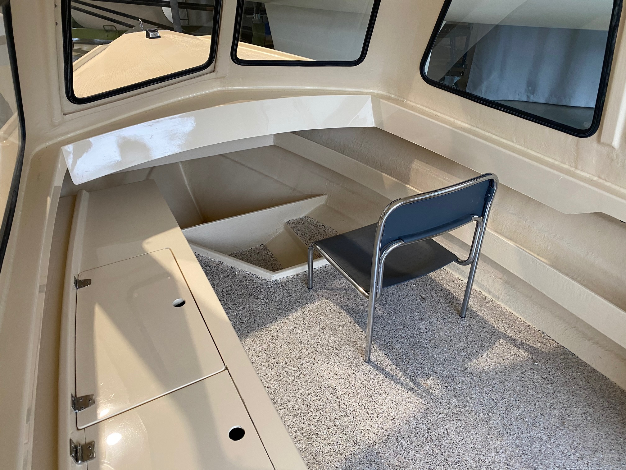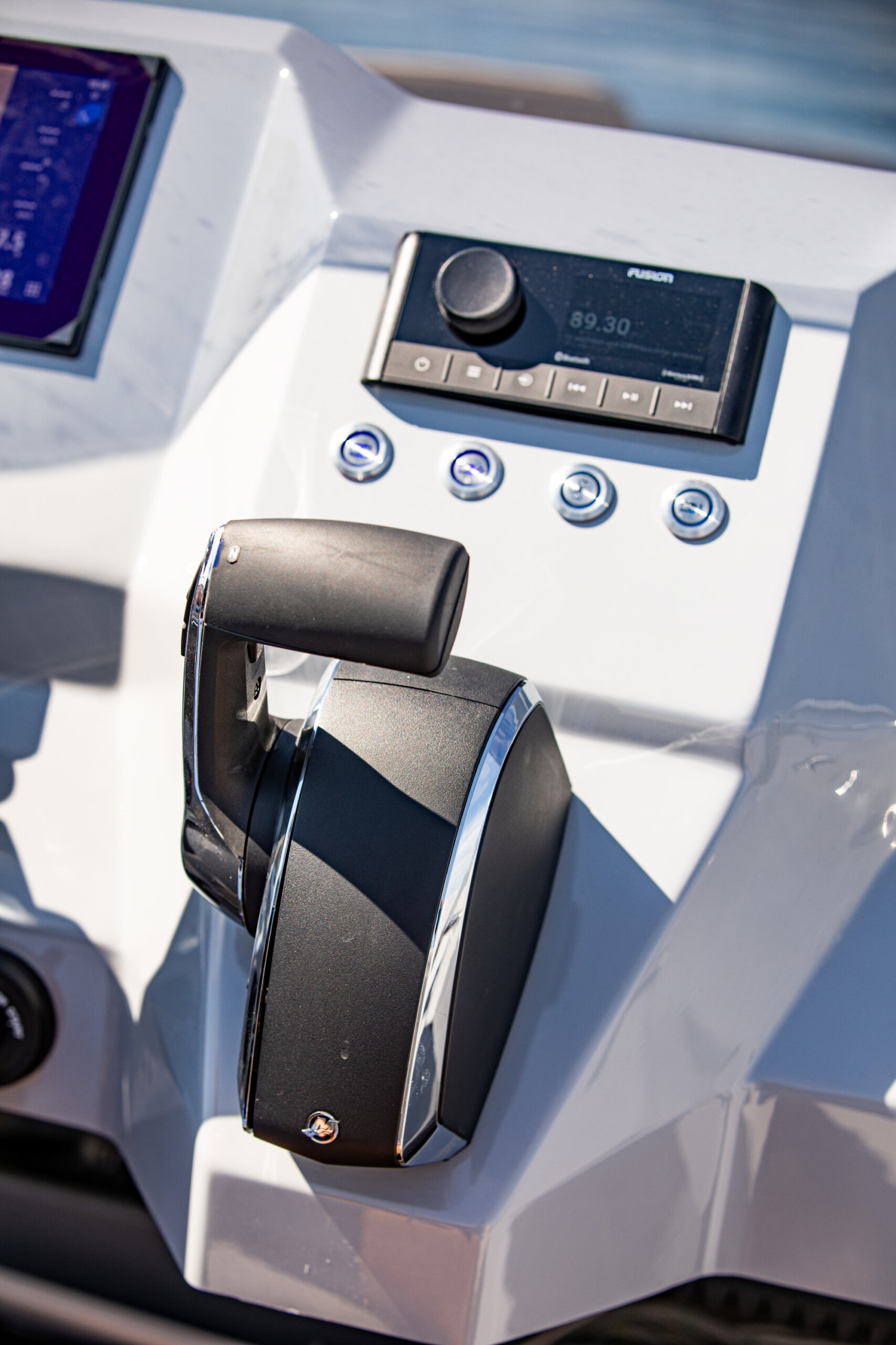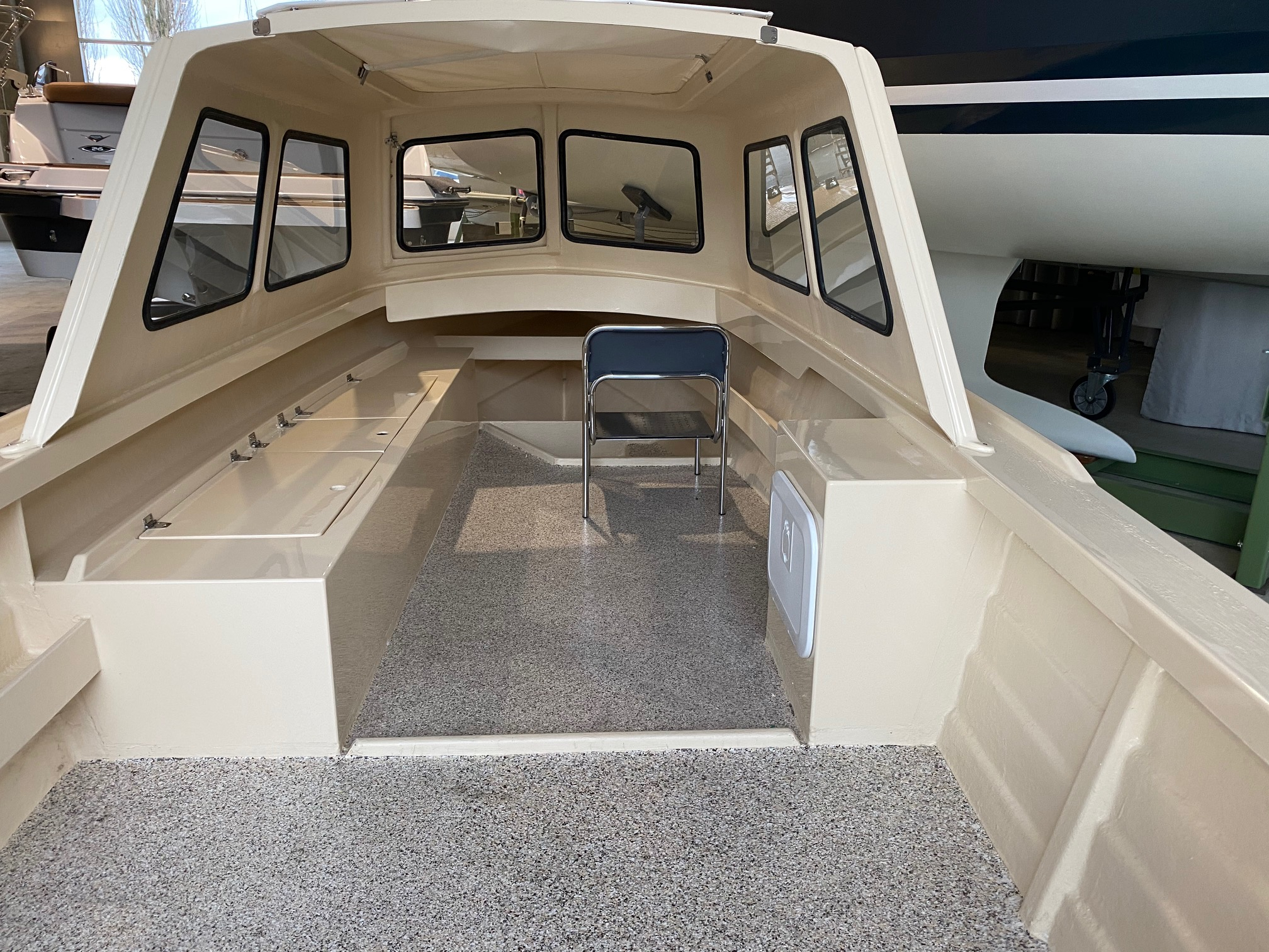 Rumpffarbe “Titanium“ (RAL 7045) Gel Coat, Flexiteak mit schwarzen Fugen, Cockpitpolster Macadamia, 2x 7“ Touchscreen mit interaktiven Steuerelementen, Echolot, Landanschluss und Ladegerät 230V, Bimini Verdeck, Cockpitpersenning