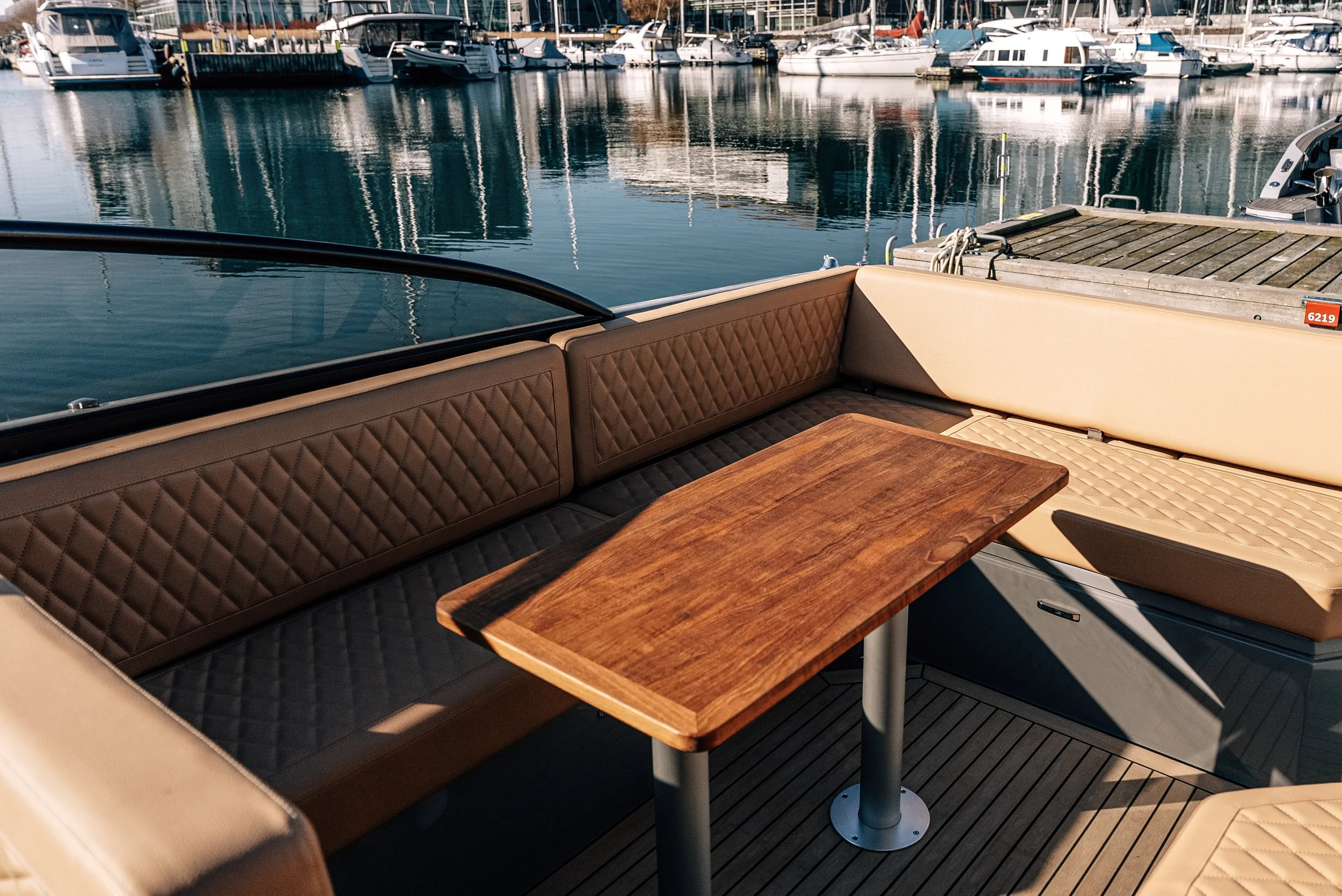 Rumpffarbe ‚Grey Sky‘ Gel Coat, Scheuerleiste in schwarz, T-Top mit schwarzen Aluminiumgestänge, Cockpitpolster Diamond Stitching “Pecan, Flexiteak “Vintage“ mit schwarzen Fugen, Premium Lichtpacket, Premium Schwimmleiter, 2x 7“ Touchscreen mit interaktiven Steuerelementen, Echolot, Bugstrahlruder, Landanschluss und Ladegerät 230V, Grosses Batteriesystem, Cockpitpantry, Waschbecken mit Staufächern, Deluxe Kühlschrank am Steuerstand und zusätzlichen Deluxe Kühlschrank, Marine WC mit Fäkalientank.