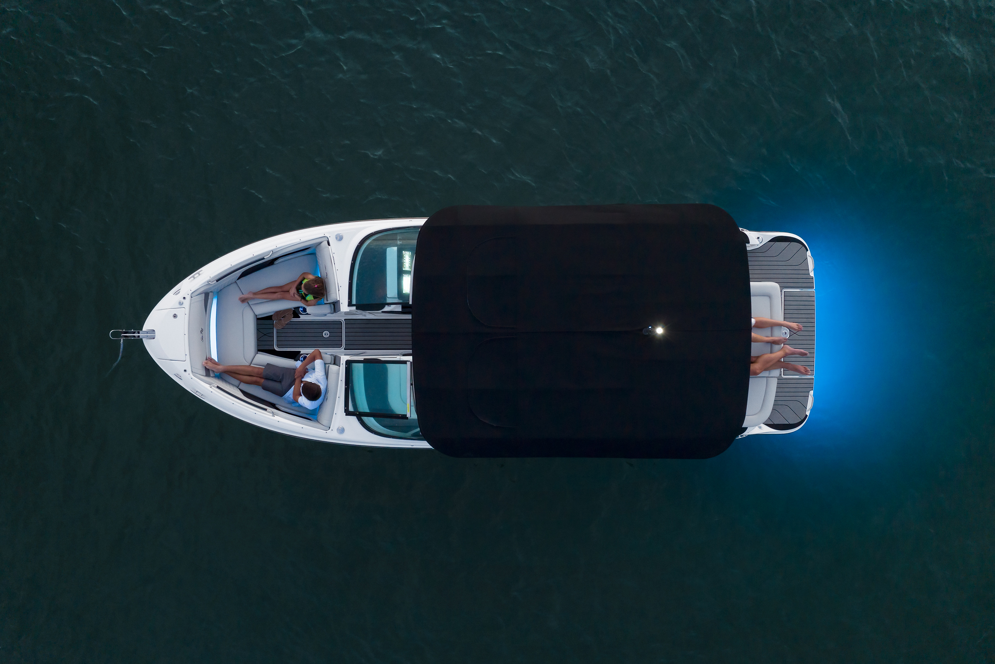 Optional sorgt das Lighting Bundle für mehrfarbige RGB-W-Beleuchtung, die jede Stimmung perfekt untermalt – inklusive beleuchtetem Sea Ray-Logo im Cockpitboden.