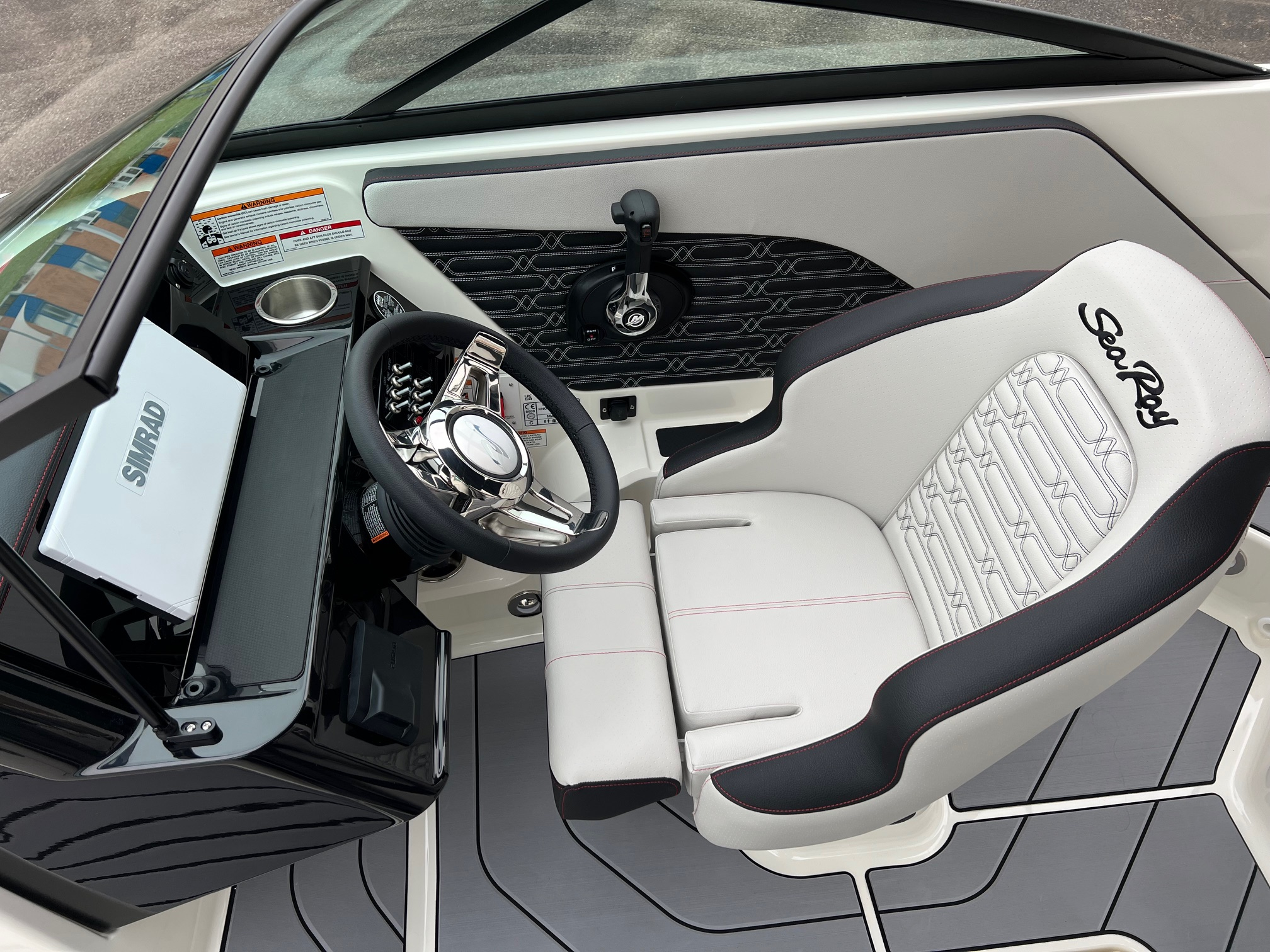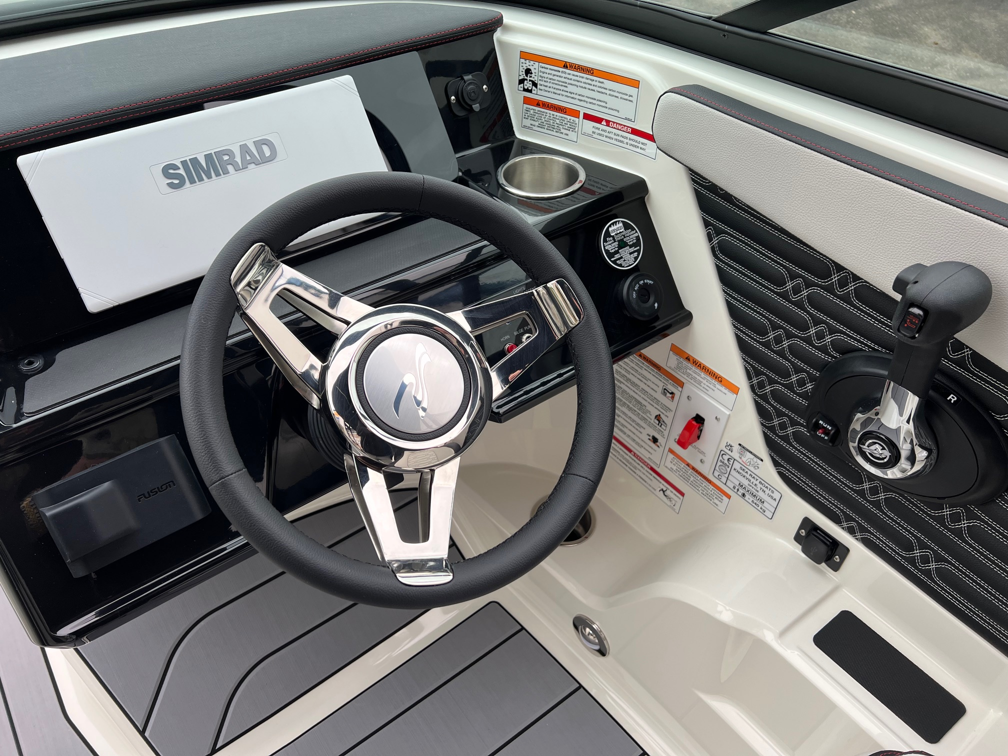 Gebogene / runde Windschutzscheibe, Cockpitbodenbelag SeaDek geklebt, Cockpitbeleuchtung LED (blau), Selbstlenzendes Cockpit STD, Stereoanlage Premium, FUSION mit Subwoofer, Echolot STD, SIMRAD Digital Dash NSX Ultra Wide 12’’, Seekarte C-Map, Luftpumpe für Wasserspielzeug, Heckdusche, Towerlicht LED 360° montiert, Unterwasserplattform manuell absenkbar, Badeplattformbelag mit SeaDek, Autom. Feuerlöschanlage im Motorraum, Handfeuerlöscher 2kg